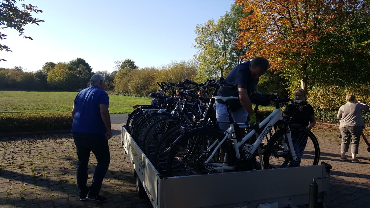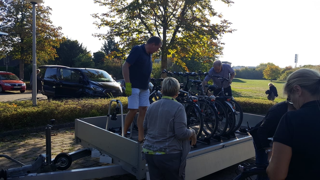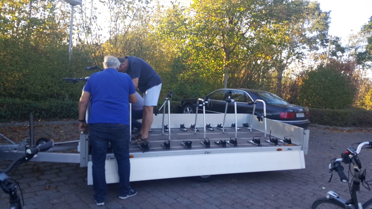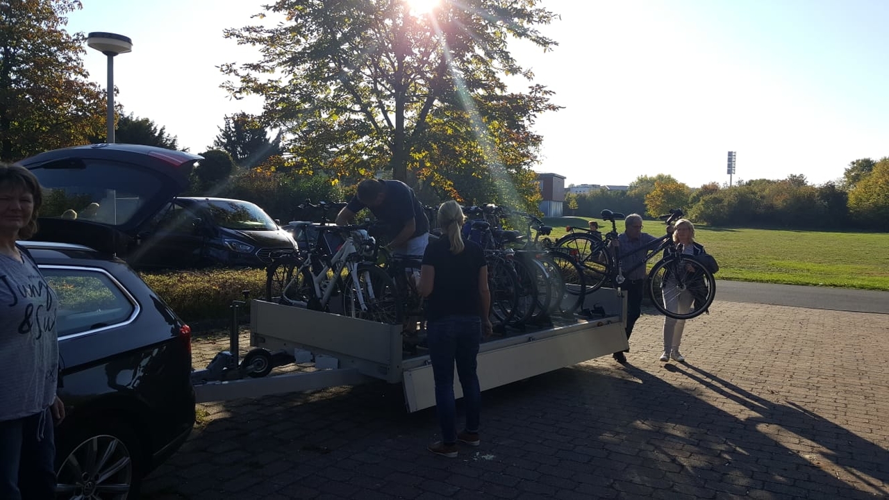 Mit einem PKW, einem Bulli, dem Anhänger "Fitzen-Express" und 12 Teilnehmern plus Fahrrädern an Bord ging es ab Stadion Weikamp zunächst nach Senden bei Münster.
