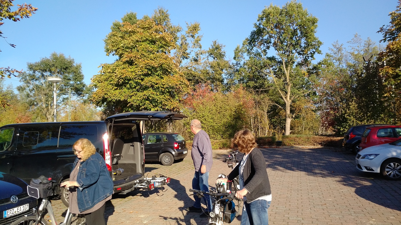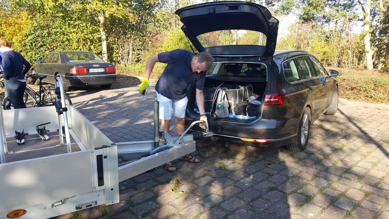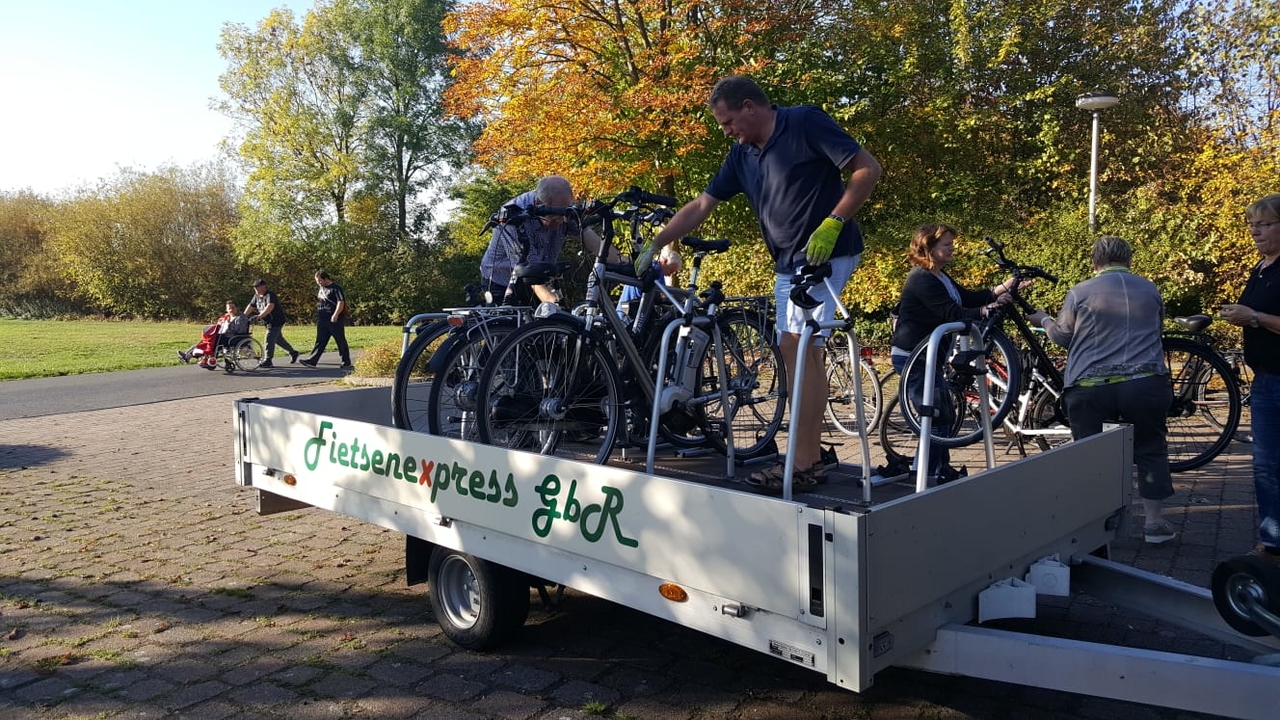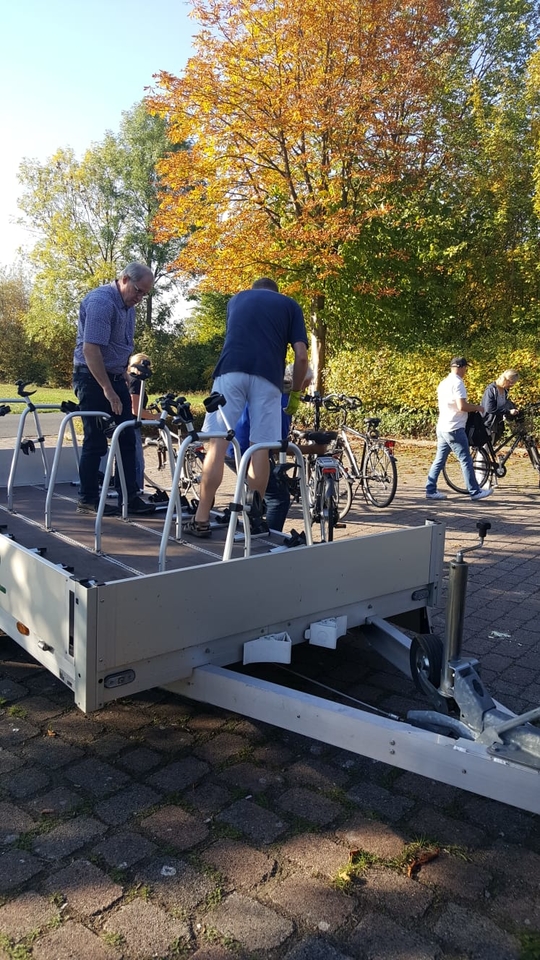 Mit einem PKW, einem Bulli, dem Anhänger "Fitzen-Express" und 12 Teilnehmern plus Fahrrädern an Bord ging es ab Stadion Weikamp zunächst nach Senden bei Münster.