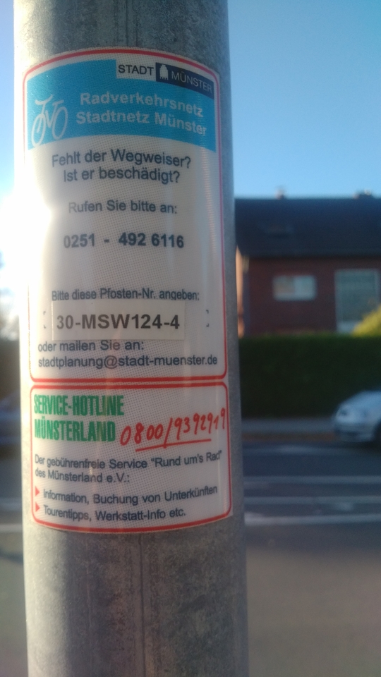 Hier kamen alle gegen 10:00 Uhr wohlbehalten an. Geparkt wurde am Bahnhof Senden-Bösensell. Nach 15 Minuten waren alle Fahrräder entladen und die 12-köpfige Mannschaften konnte starten. Die Münsterlandradwege waren direkt am Parkplatz ausgeschildert, so dass die übliche Suche diesmal entfiel.