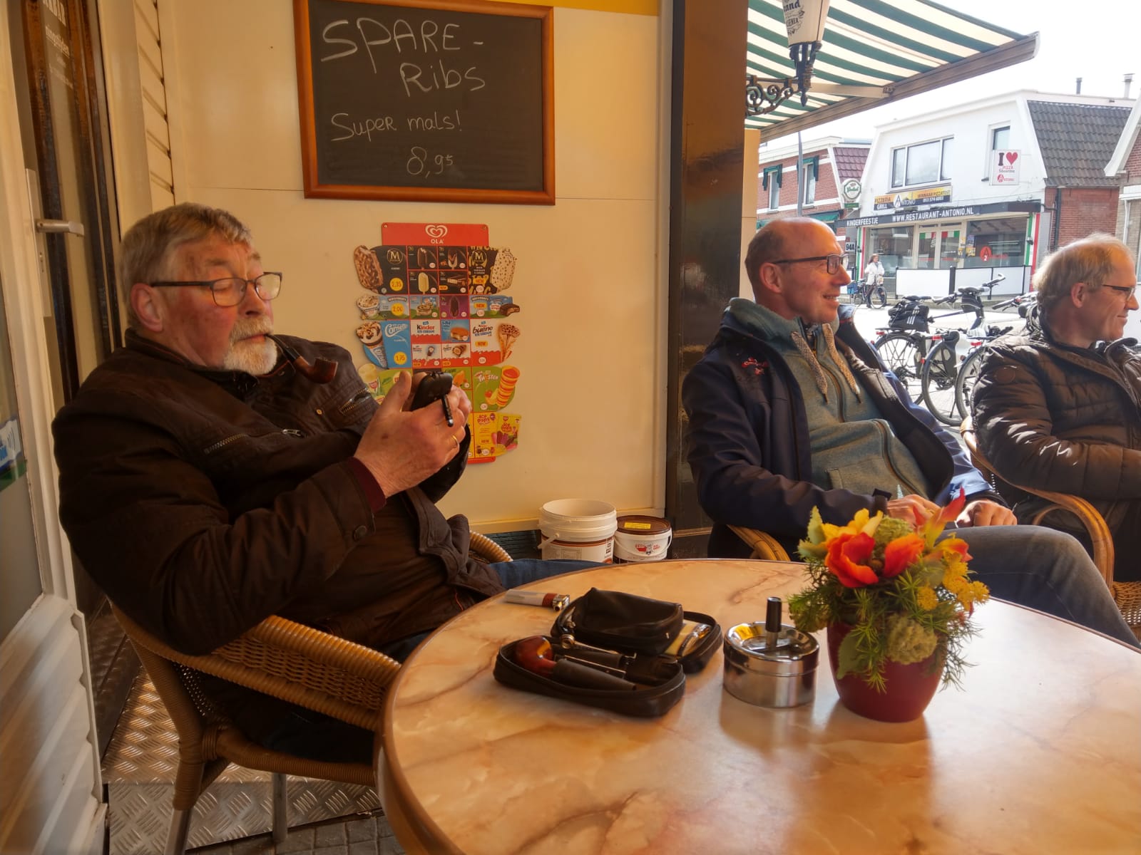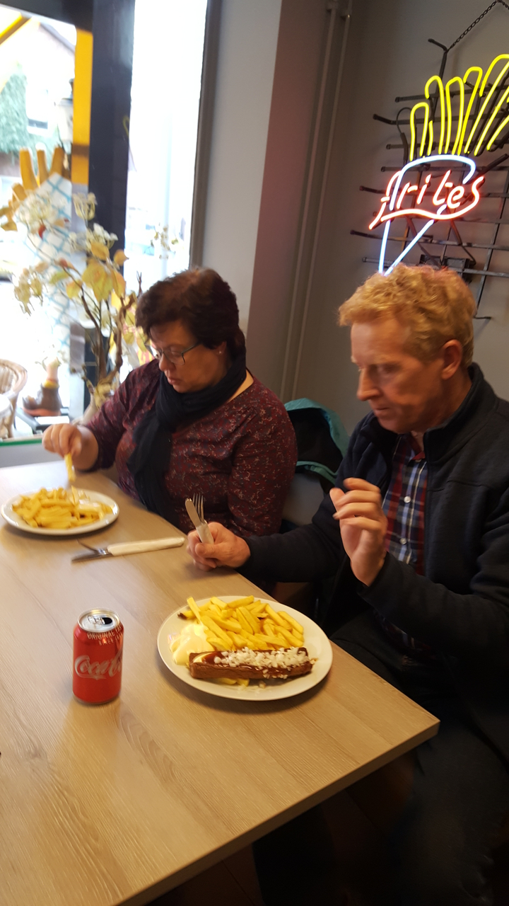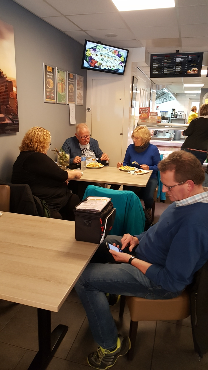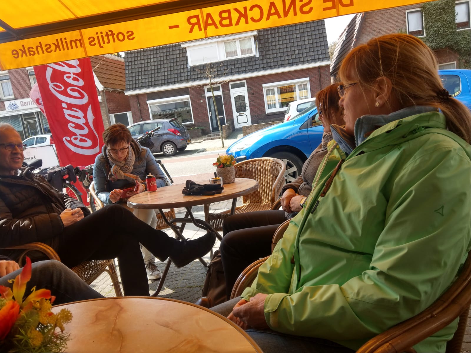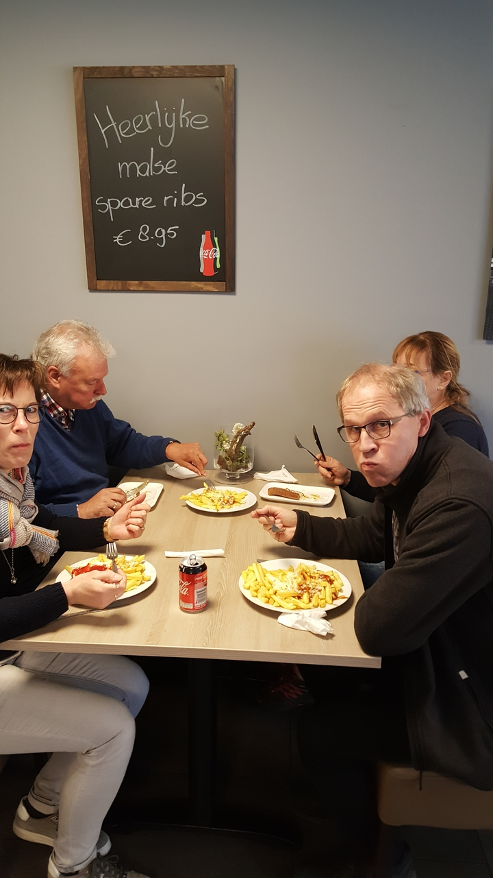 Das hat leider nicht so optimal geklappte, da einige Ausschilderungen ziemlich irreführend waren. So fand sich die ganze Gruppe nach einiger Zeit in den Niederlanden bei Losser wieder. Nach kurzem Studium der Karte ging es dann über die niederländischen Ausschilderungen über Knotenpunkte weiter. Aber auch hier fehlte die ein oder andere Auszeichnung. So ergaben sich eine Suchen nach dem richtigen Weg. Über einige ungeplante Fahrradwege - deren Strecken aber doch sehr schön waren - kam die Truppe dann in Overdinkel an. Inzwischen war es auch schon 13:30 Uhr und eine Einkehr zum Mittagessen wurde allerhöchste Zeit. So entschied man sich kurzfristig für eine echte niederländische Pommesbude.