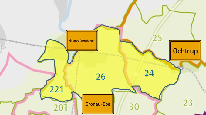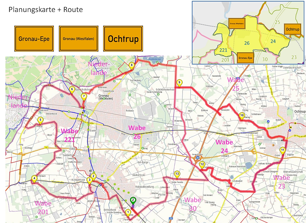 Hier wurde im Industriegebiet geparkt und die Räder abgeladen und fahrbereit gemacht. Gegen 10:35 Uhr konnte die 16-köpfige Mannschaften starten. Die Münsterlandradwege waren nur wenige 100 Meter vom Parkplatz entfernt ausgeschildert und so waren alle ziemlich schnell auf dem offiziellen Radweg unterwegs. Zunächst ging es auf landwirtschaftlichen Wegen Richtung Gronau und weiter durch die Innenstadt zur niederländischen Grenze.