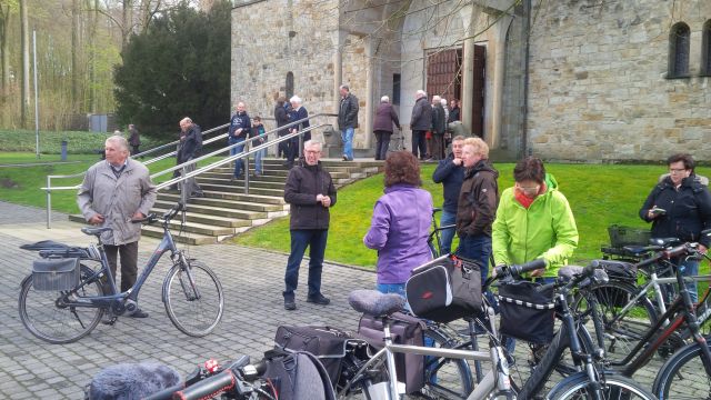Dort angekommen wurde direkt der geplante Parkplatz angesteuert, abgeladen und aufgesattelt. Zwei weitere Teilnehmer warteten schon am Parkplatz auf die Mitfahrt. Dann ging es nach kurzer Suche der richtigen ausgewiesenen Strecke auf zum ersten kleinen Etappenziel, Kloster Gerleve. Nach einigen Höhen und Tiefen erreichten wir nach knapp einer Stunde das Kloster. Die Sonntagsmesse war gerade beendet so dass wir Gelegenheit hatten die Klosterkirche zu besichtigen. Danach ging es weiter Richtung Rorup, wobei uns Berg- und Talfahrten zunächst weiter begleiteten. Dabei hatten die E-Bikes natürlich die Nase vorn, wenn es bergauf ging - gilt aber nur solange die Akkus auch geladen sind.