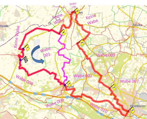 Der Hunger ließ zu diesem Zeitpunkt noch auf sich warten daher beschlossen alle Teilnehmer gemeinsam, zunächst die angekündigte Steigung zwischen Ibbenbüren und Hopsten (den Dickenberg) hinter sich zu bringen. Danach würde sich der Hunger wohl einstellen. Mit gelöschtem Durst und eine Runde um den Ibbenbürener Aasee ging es nach 30 Minuten zurück zu unseren Waben, die wir am Anfang von Ibbenbüren für den Aasee-Abstecher verlassen hatten. Es ging auf gleicher Strecke zurück und nach einigen Minuten war die Gruppe wieder auf Kurs der Wabe 2/7 zunächst Richtung Püsselbüren. Es ging noch ein ganze Zeit auf flachen Wegen am Rand des Teutoburger Waldes entlang. Bis dann der angekündigte Anstieg uns auf auf den Dickenberg führte. Hier verpassen wir dann auch wohl eine Abzweigung der Wabe so dass wir zwar oben angekommen aber ohne weitere Beschilderung dastanden. Den Anstieg wieder herunter zu fahren kam für alle nicht in Frage. Daher wurde die Radfahrkarte ausgepackt und die Richtung nach Hopsten ungefähr bestimmt. Nach einer 3/4 Stunde "Richtungsfahrt" kamen wir dann in Obersteinbeck an und beschlossen bei Mutter Bahr in Uffeln einzukehren. Auf die kurze Fahrt dahin fanden wir dann auch die Beschilderung der Wabe 2 wieder. Nach einer ausgiebigen Pause ging es weiter der Wabe 2 folgend Richtung Hopsten. Auch eine schöne Strecke.