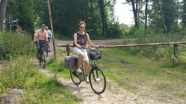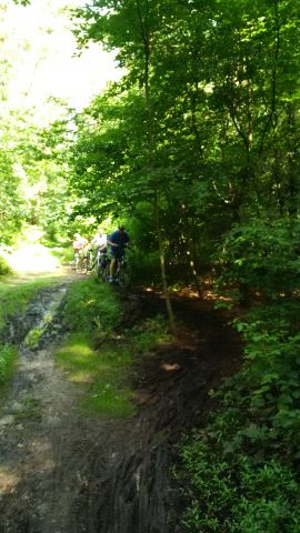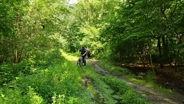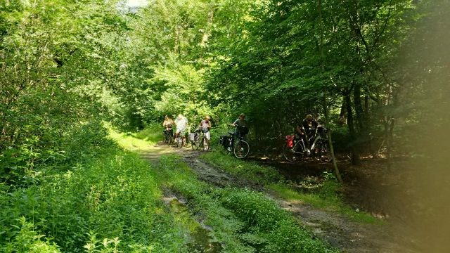 Das kann dann auch schon mal seinen Preis haben. Nach einer Stunde bekommen wir die Natur auch mal anders zu spüren. Die Sandwege sind von den Regenschauern der letzten Tage an einigen Stellen doch noch aufgeweicht und wir müssen den ersten Pfützen und Suhlen ausweichen. Noch lässt sich das ganz gut bewerkstelligen aber es soll noch schlimmer kommen. Mitten in einem Waldstück, werden die Wege im enger und die Pfützen immer zahlreicher, bis dann nichts mehr geht. Absteigen ist angesagt und es geht Schritt für Schritt, teilweise durch verwachsene Pfade und einer Pfützen- und Seenlandschaft. Aber auch dieser Abschnitt löst sich nach einigen Minuten in Wohlgefallen auf. Nachdem sich alle Teilnehmer wieder vollständig gesammelt haben, noch eine kurze Trinkpause, bevor es fahrend weitergehen kann.