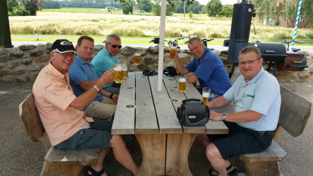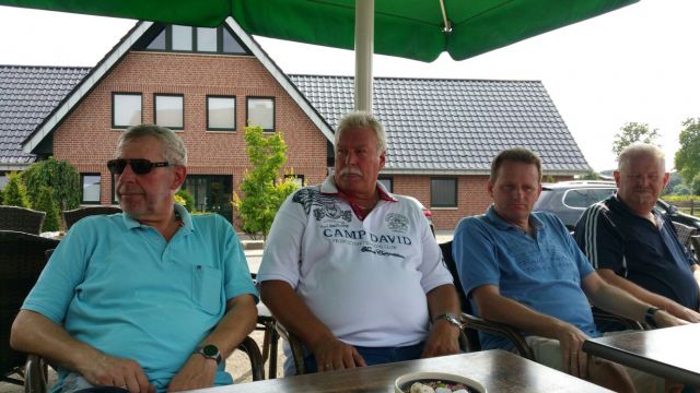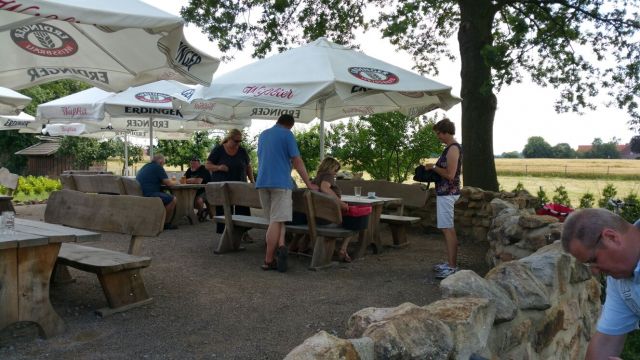 Nach einiger Zeit erreichen wir dann eine Gaststätte zwischen Borghorst und Emsdetten mit einem einladenden Biergarten. Die schon teils ersehnte Mittagspause kann eingeläutet werden. Wir besetzen zwei Tische im Biergarten und lassen es uns gut gehen. Kalte Getränke und eine Speisekarte mit einigen bayrischen und westfälischen Leckereien versüßen uns den Aufenthalt. Mehr als eine Stunde – vielleicht ein bisschen zu lange - verbringen wir so unter einer angenehmen Brise im Biergarten. Ausgeruht geht es dann weiter, wir haben mal gerade die Hälfte der geplanten Route gefahren es liegt also noch ein Stück Weg vor uns.
