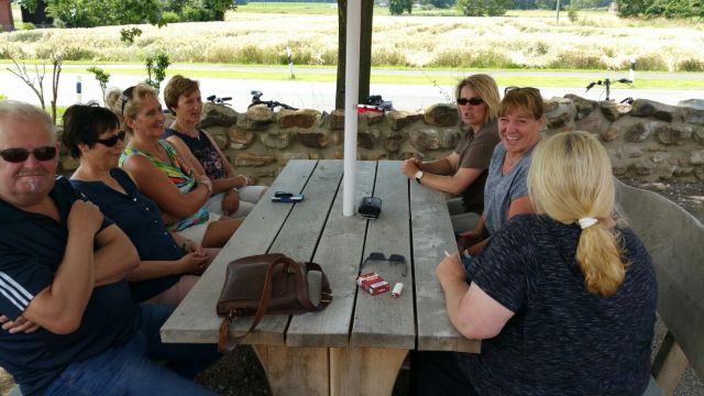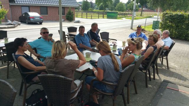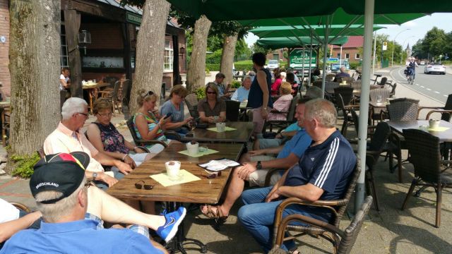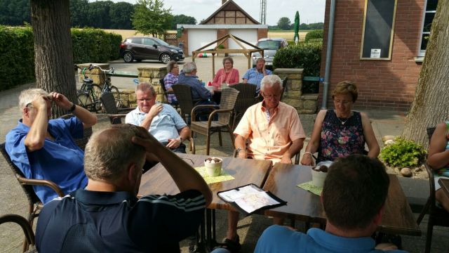 Nach 7 ½ km erreichten wir Hembergen und ließen uns in einem geöffneten Biergarten nieder. Mit Kaltgetränken sowie Kaffee, Kuchen und Eis wurde noch einmal eine ausgiebige Pause eingeläutet. Man hatte sich schließlich schon so manches von der Fahrt zu erzählen.