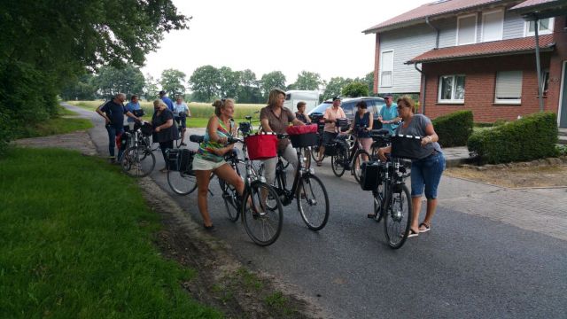 Gegen 17:45 Uhr wurde es dann doch ein wenig hektisch. Jutta und Renate hatten beschlossen den Weg von Hembergen nach Dreierwalde noch mit dem Fahrrad zu fahren, nachdem man sich zuvor ausgiebig über mögliche Strecken durch einen Blick ins Google Fahrradnavigationssystem informiert hatte. Zieht man die 10 km ab, die der Rest noch zurück nach Emsdetten zu bewältigen hat, ist der Weg bis nach Dreierwalde gar nicht mehr so weit. Und darüber hinaus waren die Akkus ja auch noch gut mit Strom befüllt. So war die Entscheidung gefallen und die Gruppe hatte für die weitere Fahrt zwei Teilnehmer weniger. Auch für Klaus und Heike wurde es zeitlich knapp da sie um 18:30 Uhr spätestens zu Hause sein mussten. Sie entschieden sich den kürzesten Weg an der Landstraße entlang nach Emsdetten zu fahren. Damit setzten sich dann nur noch 9 Teilnehmer auf der geplanten Route in Bewegung. Der weitere Streckenverlauf konnte nochmal mit schönsten Feld- und Waldwegen aufwarten und wir erreichten schließlich Emsdetten und unsere geparkten Autos. Schnell noch Räder aufladen, Gepäck verstauen und alle Teilnehmer auf die Autos verteilen. 30 Minuten später hatte uns unser Dorf Dreierwalde wieder. Über WhatsApp war inzwischen auch die Info eingegangen, dass die restlichen 4 Teilnehmer pünktlich und wohlbehalten in Dreierwalde eingetroffen sind.