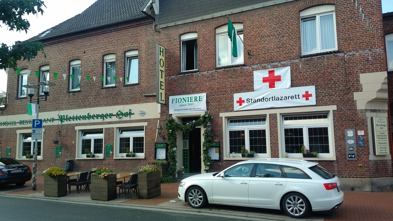 Unsere Tour startet und endet direkt in Nordkirchen. Ein Parkplatz an einem Supermarkt ist schnell gefunden. Was wir nicht wussten, ist, dass Nordkirchen an diesem Wochenende Schützenfest feiert. Nach dem Aufsatteln der Räder kommen uns schon die ersten Schützenkompanien entgegen. Wir lassen uns aber nicht lange abhalten und fahren Richtung Schloss auf den schnell gefundenen ausgeschilderten Radwegen.