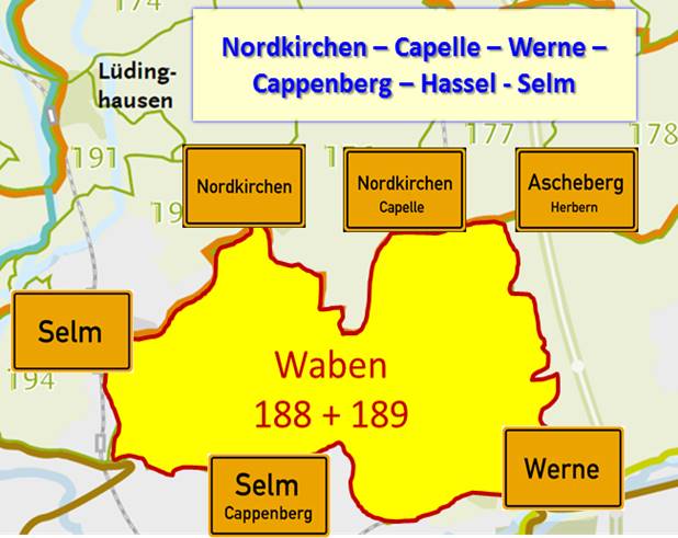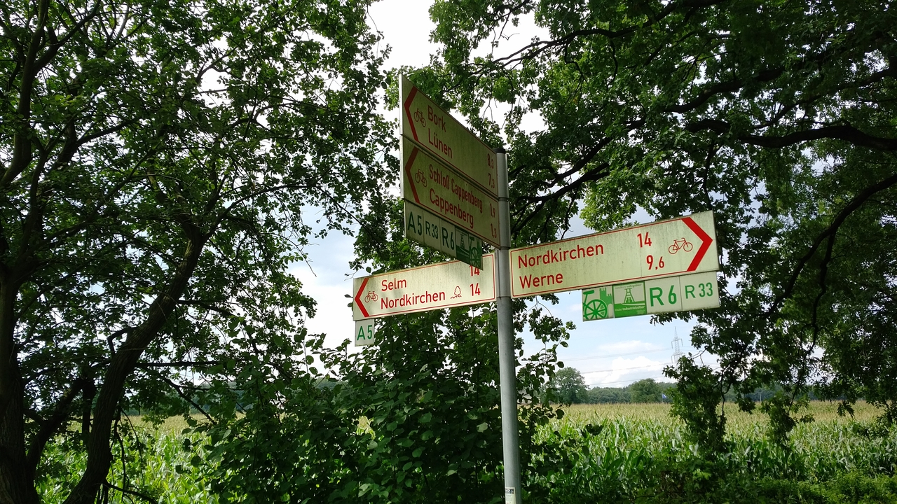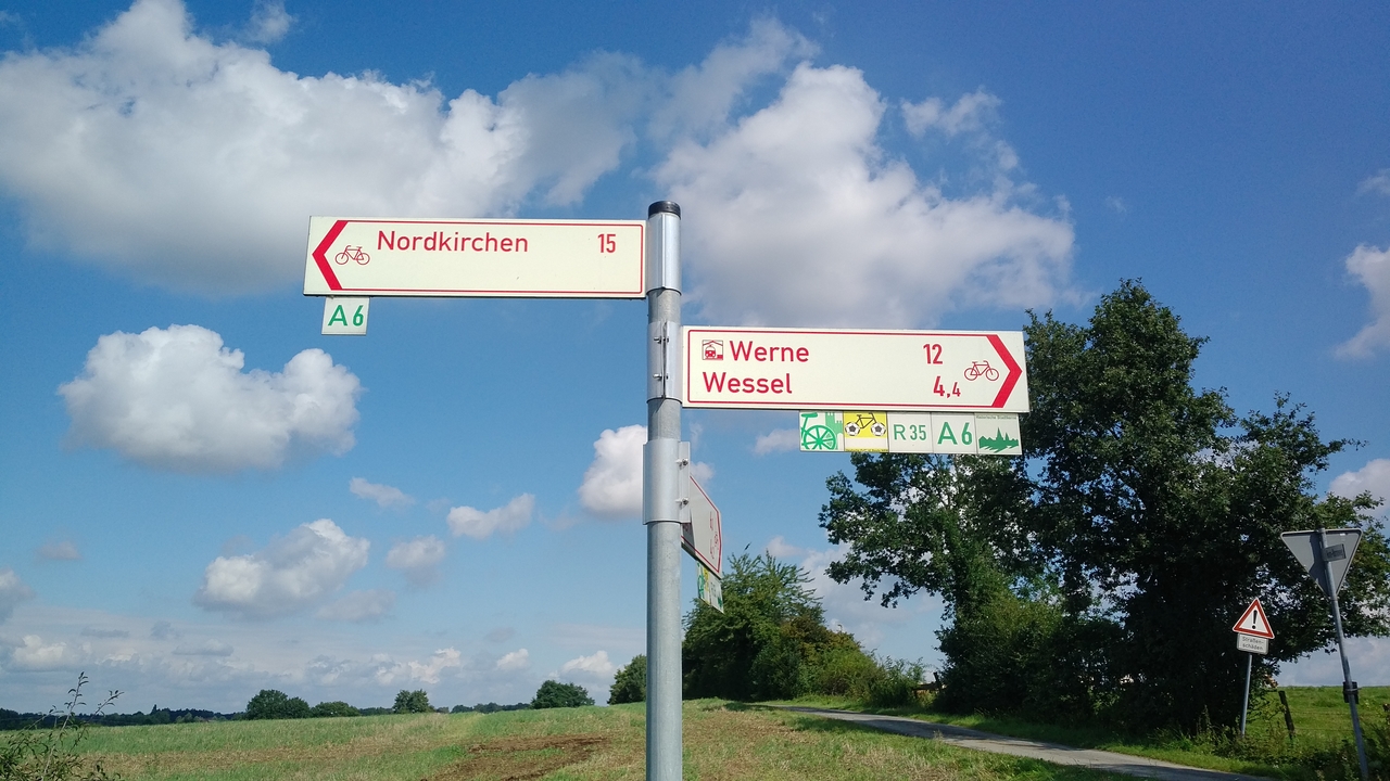 Die Radwegeausschilderung an sich ist auch in Ordnung, nur unsere Zahlen für die Waben fehlen an vielen Schildern. So müssen wir uns umstellen und uns an Ortsnamen orientieren.