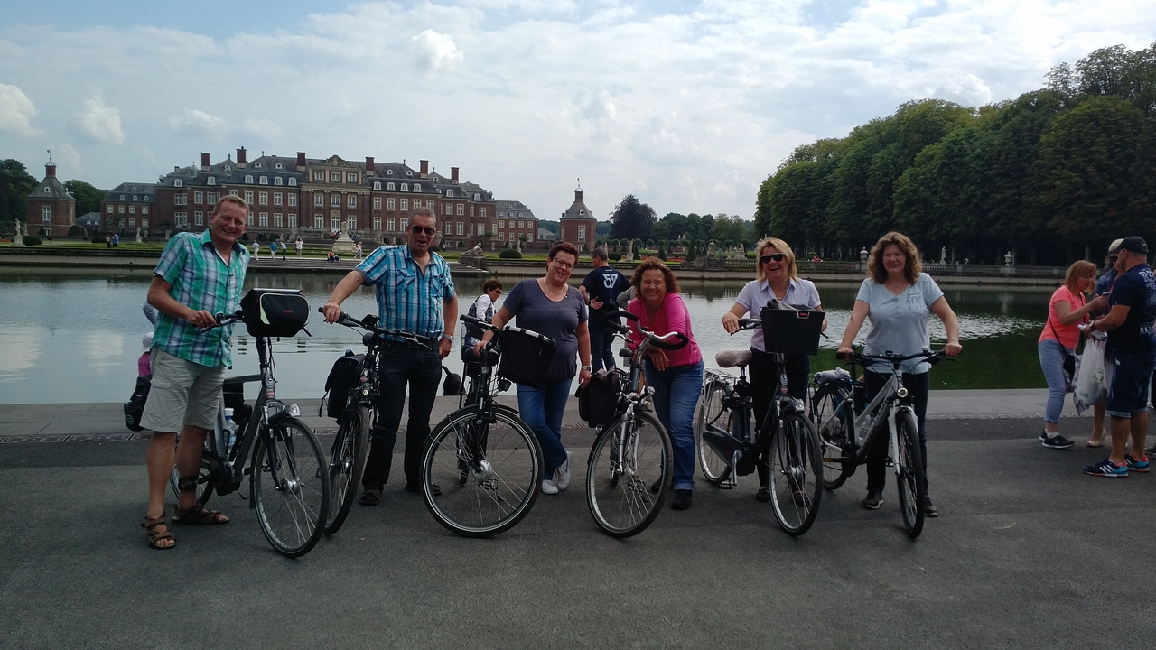 Schnell noch ein Gruppenfoto mit Schloss und dann geht es zurück zum Fahrradanhänger.