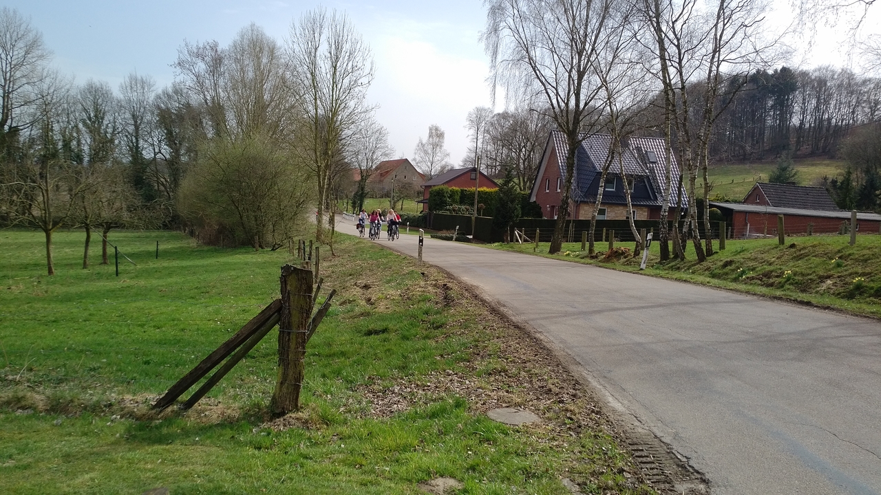 Oben angekommen empfängt uns bereits ein Streckenposten. Hier findet heute ein Radrennen statt und die ersten Teilnehmer müssen jeden Moment hier durchkommen. Wir warten auf die erste Gruppe, bevor alle einigermaßen erholt die Tour fortsetzen können. Weiter geht es nach Laggenbeck. Hier durchqueren wir eine großes Wohngebiet bevor es weiter in Richtung Lotte geht.
