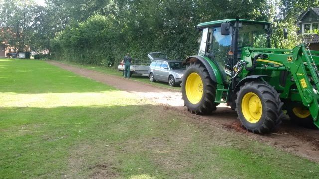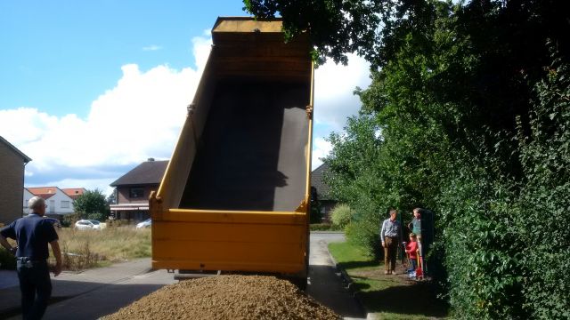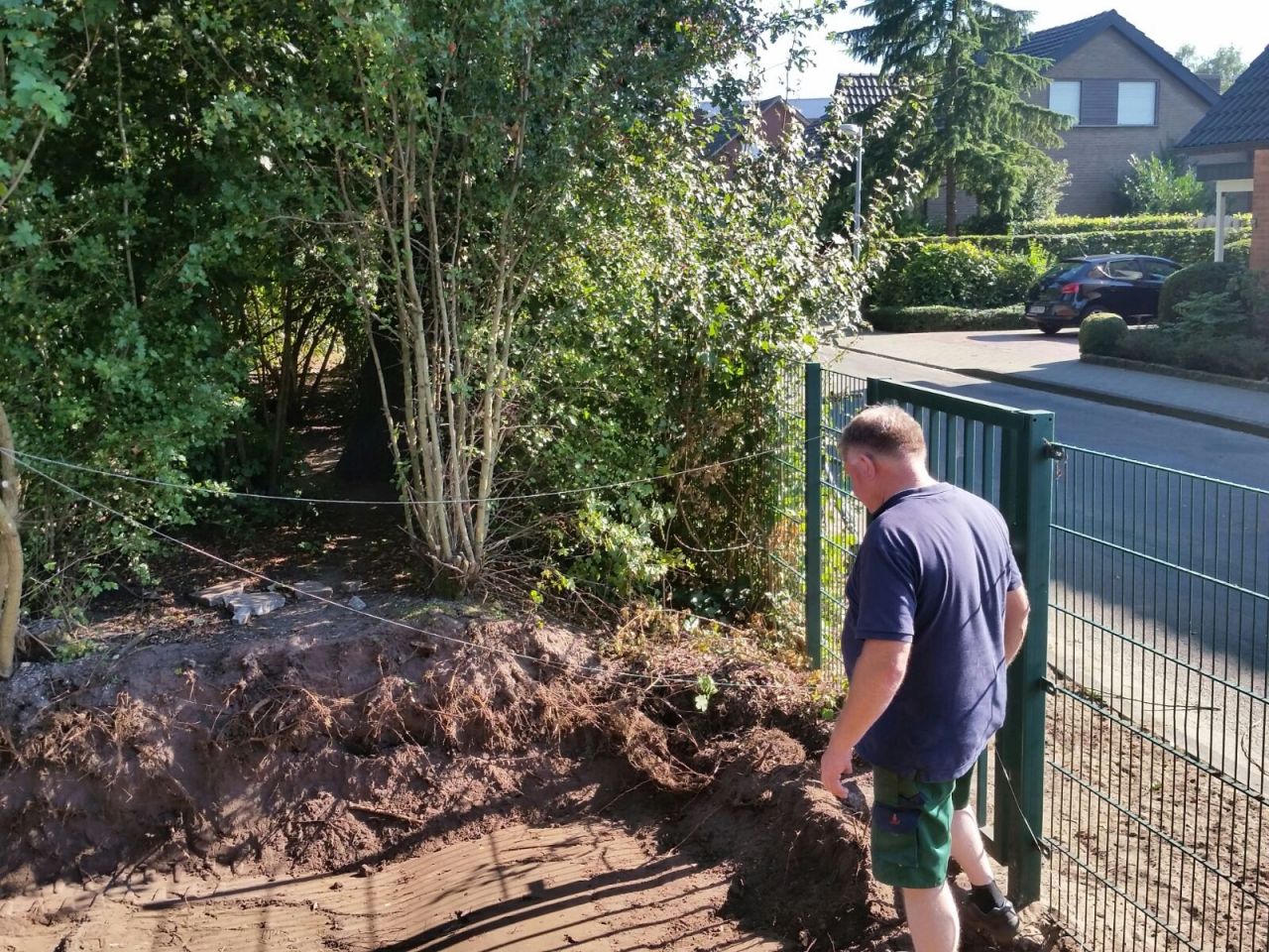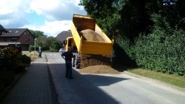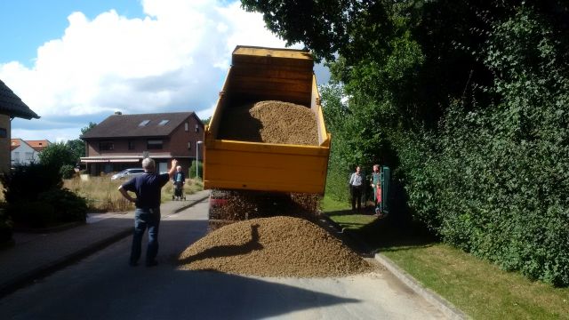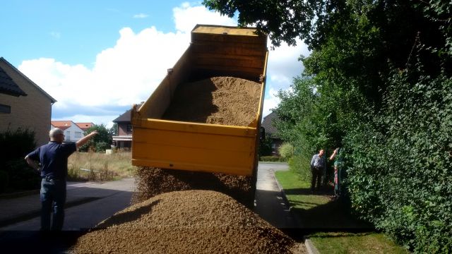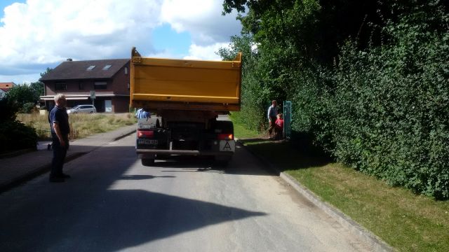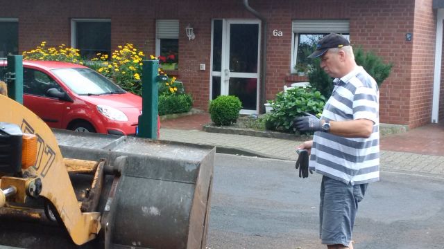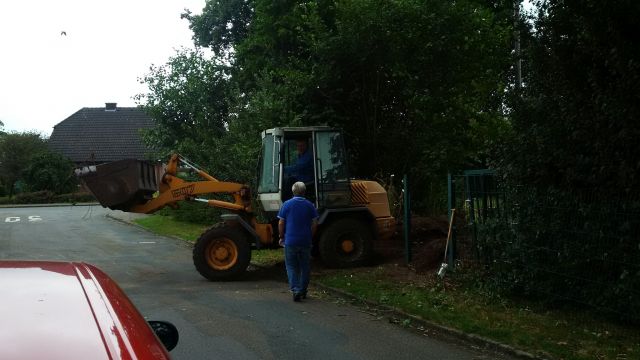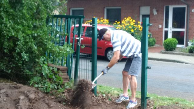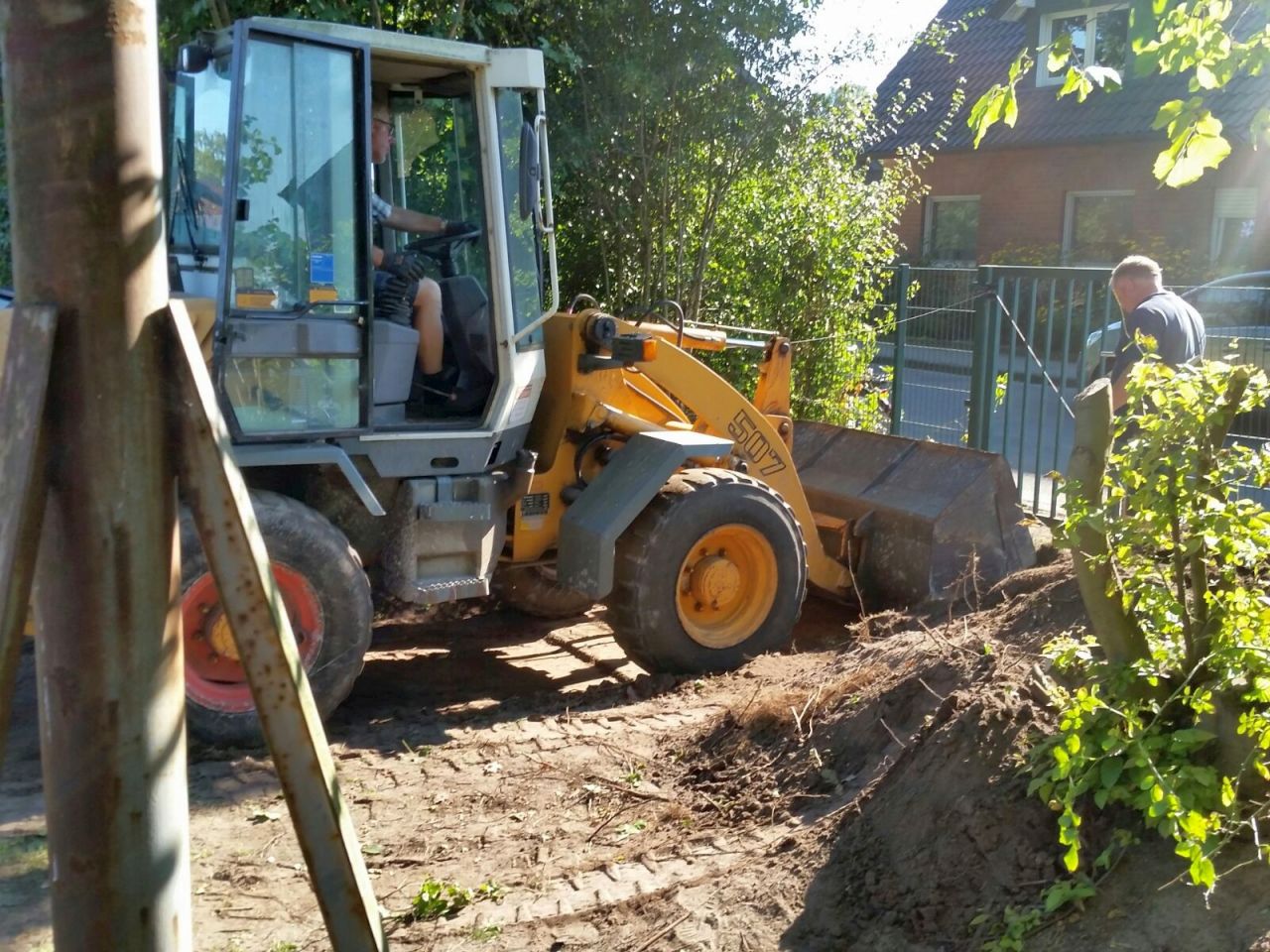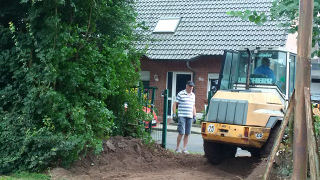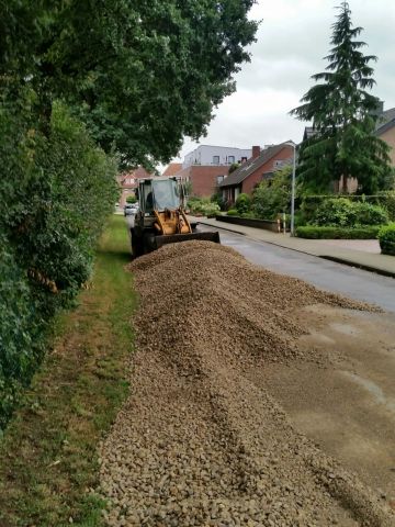 Absenkung des Bordsteins (durch Stadt Hörstel), Abtragung Boden und Auffüllen Hecke, Schotterschicht für Zugangweg, Klärung weiteres Material und Anordnung der Pflastersteine