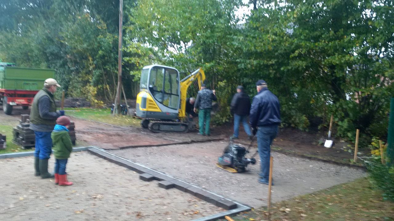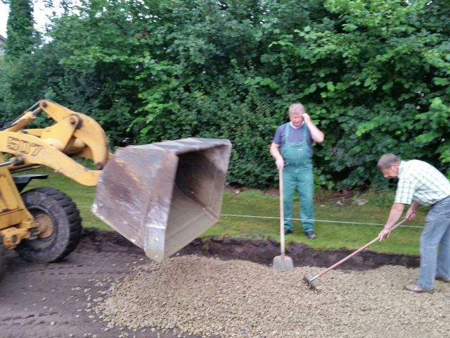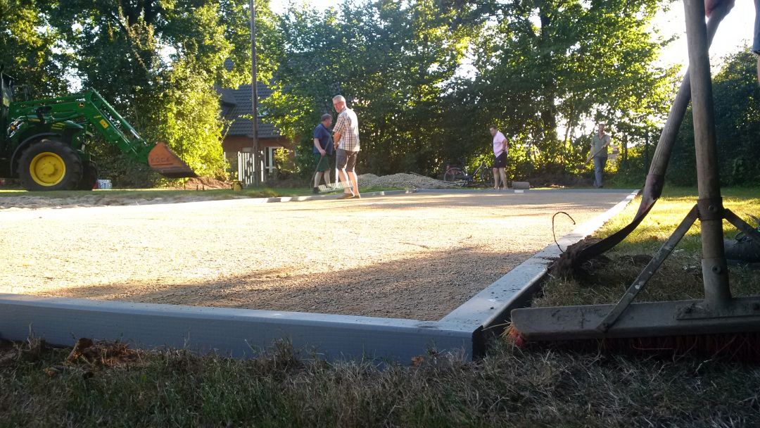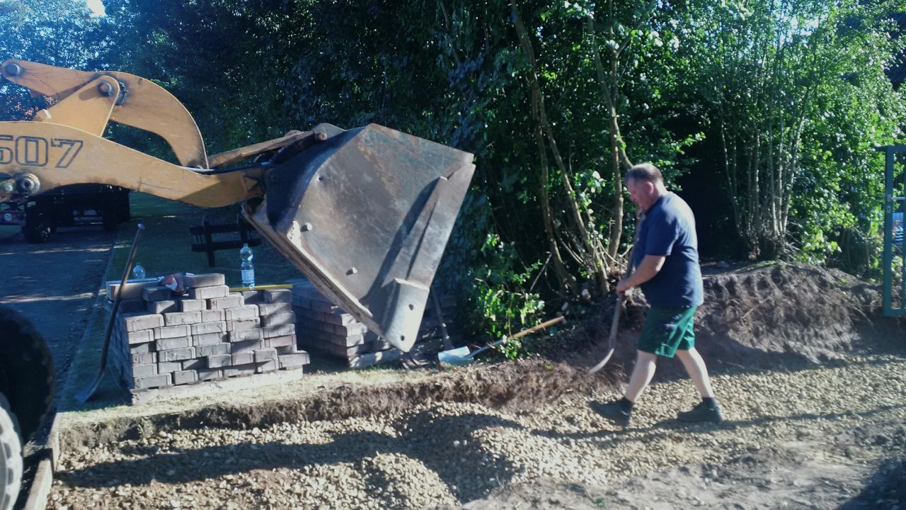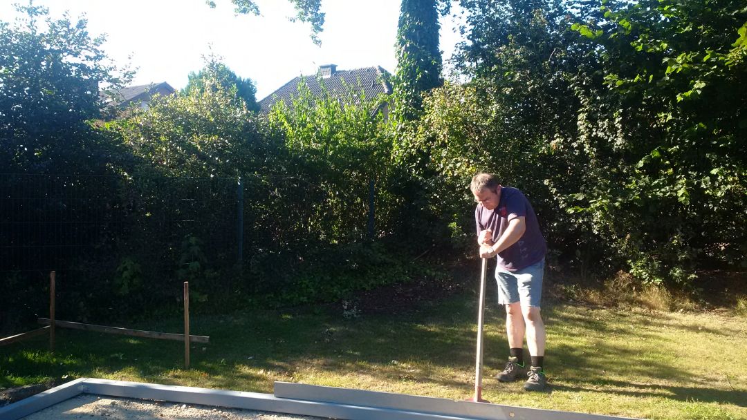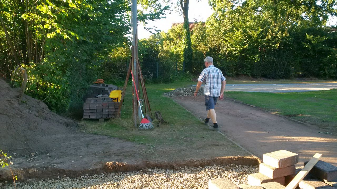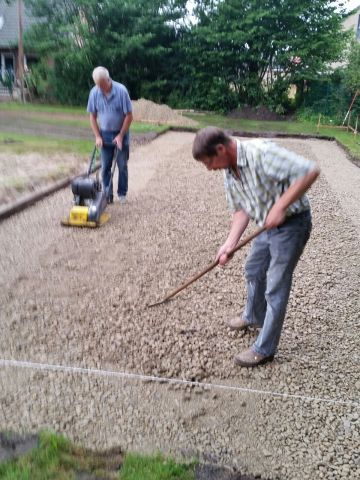 Vorbereitung Pflasterfläche an der Boule Bahn für späteren Unterstand und Hütte.