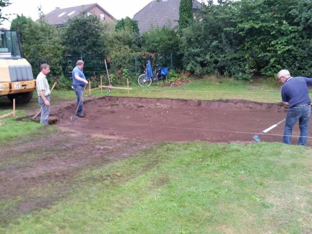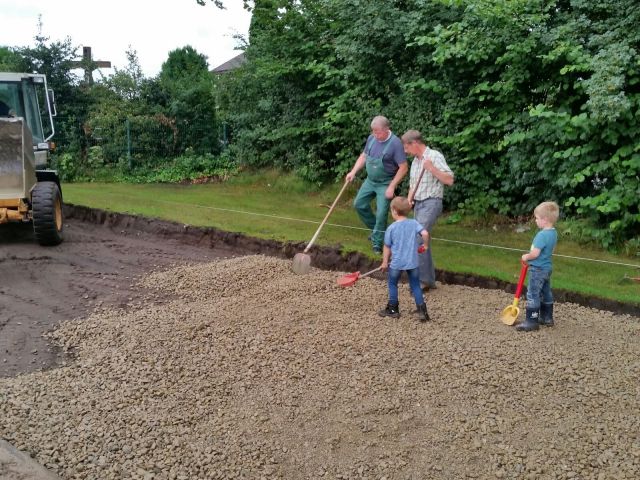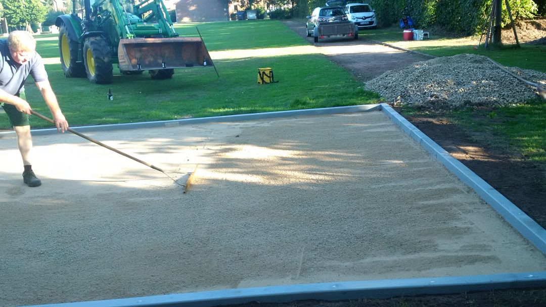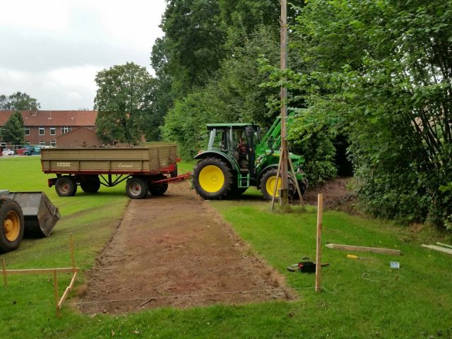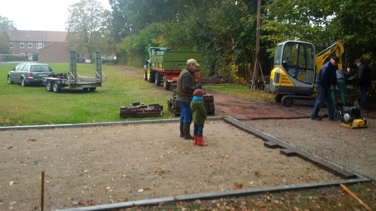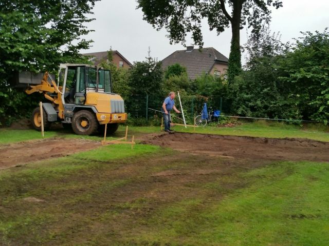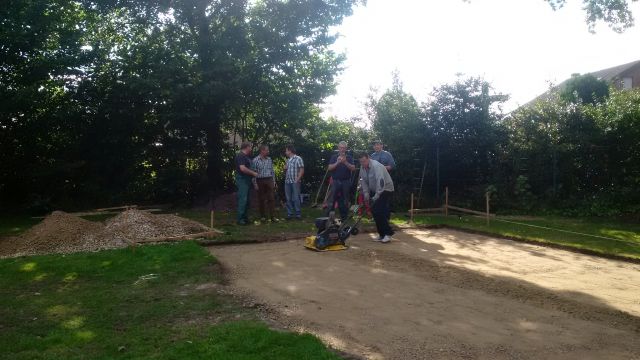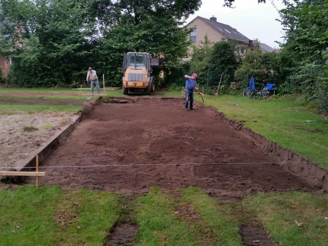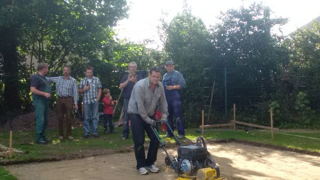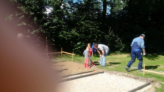 Vorbereitung Pflasterfläche an der Boule Bahn für späteren Unterstand und Hütte.