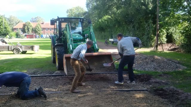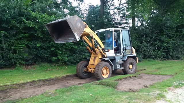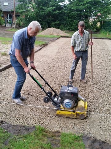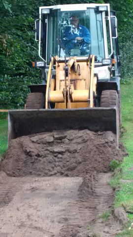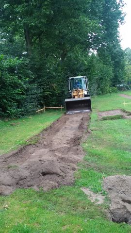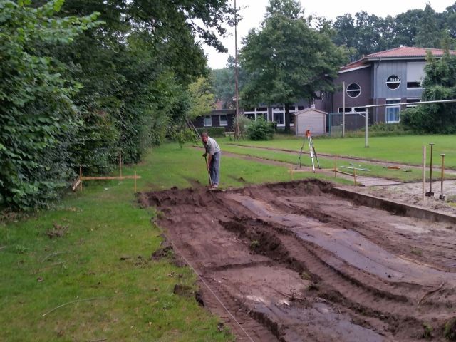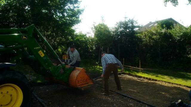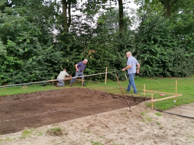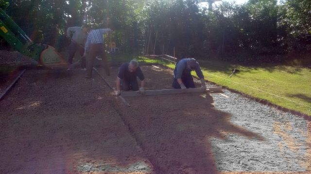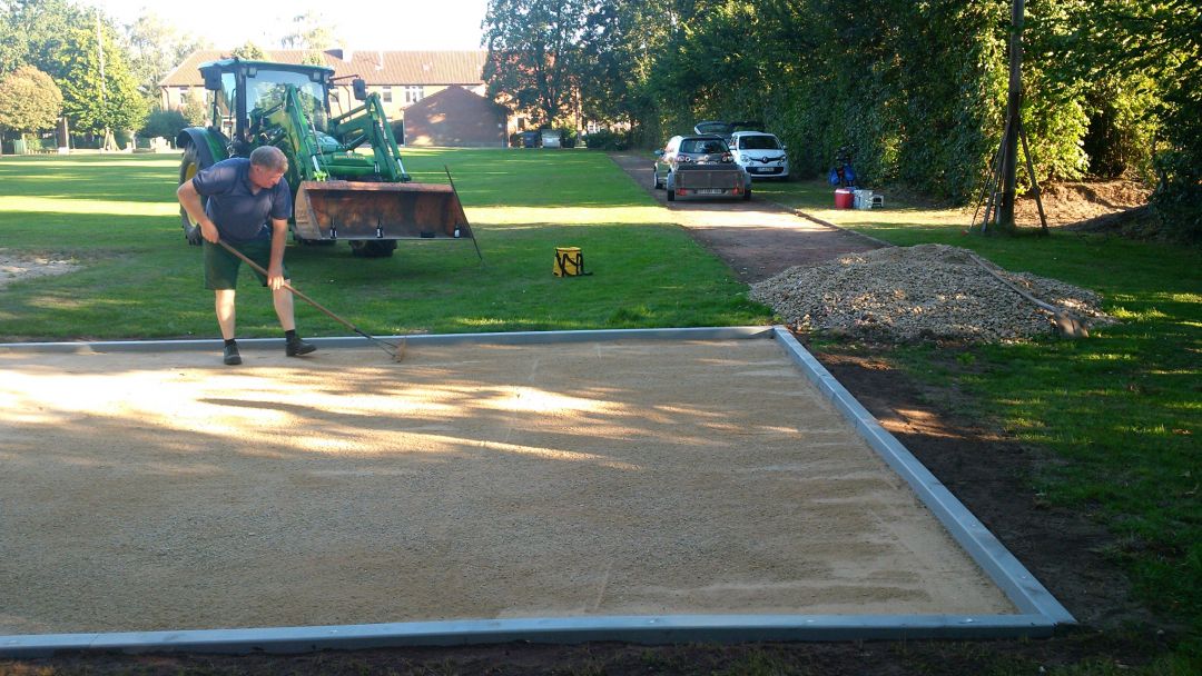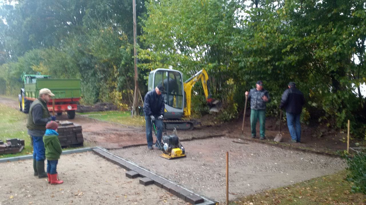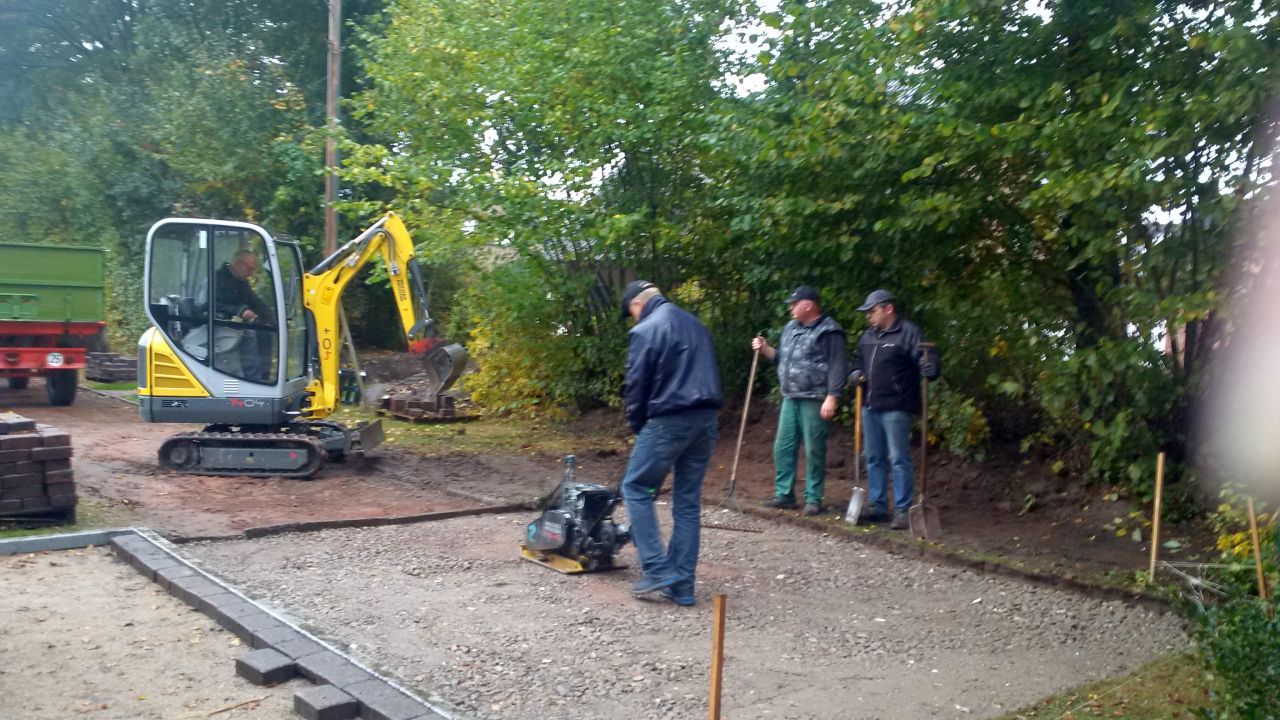 Vorbereitung Pflasterfläche an der Boule Bahn für späteren Unterstand und Hütte.