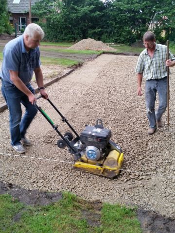 Erste Schotterschicht ist fertig - einige Tage Bewässerung und Walzen stehen an
