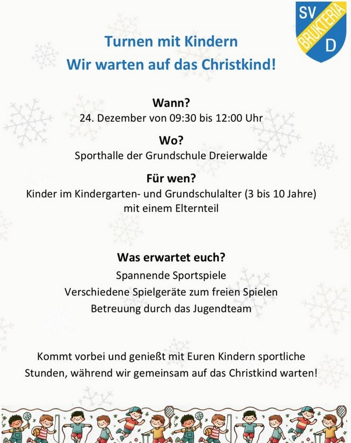 Die ca. 40 anwesenden Kinder, vorwiegend mit Ihren Vätern Kinderturnen Heiligabend 2025hatten viel Spaß und nach so viel Bewegung ist dann vermutlich auch die Bescherung besinnlich und ruhig ausgefallen.
