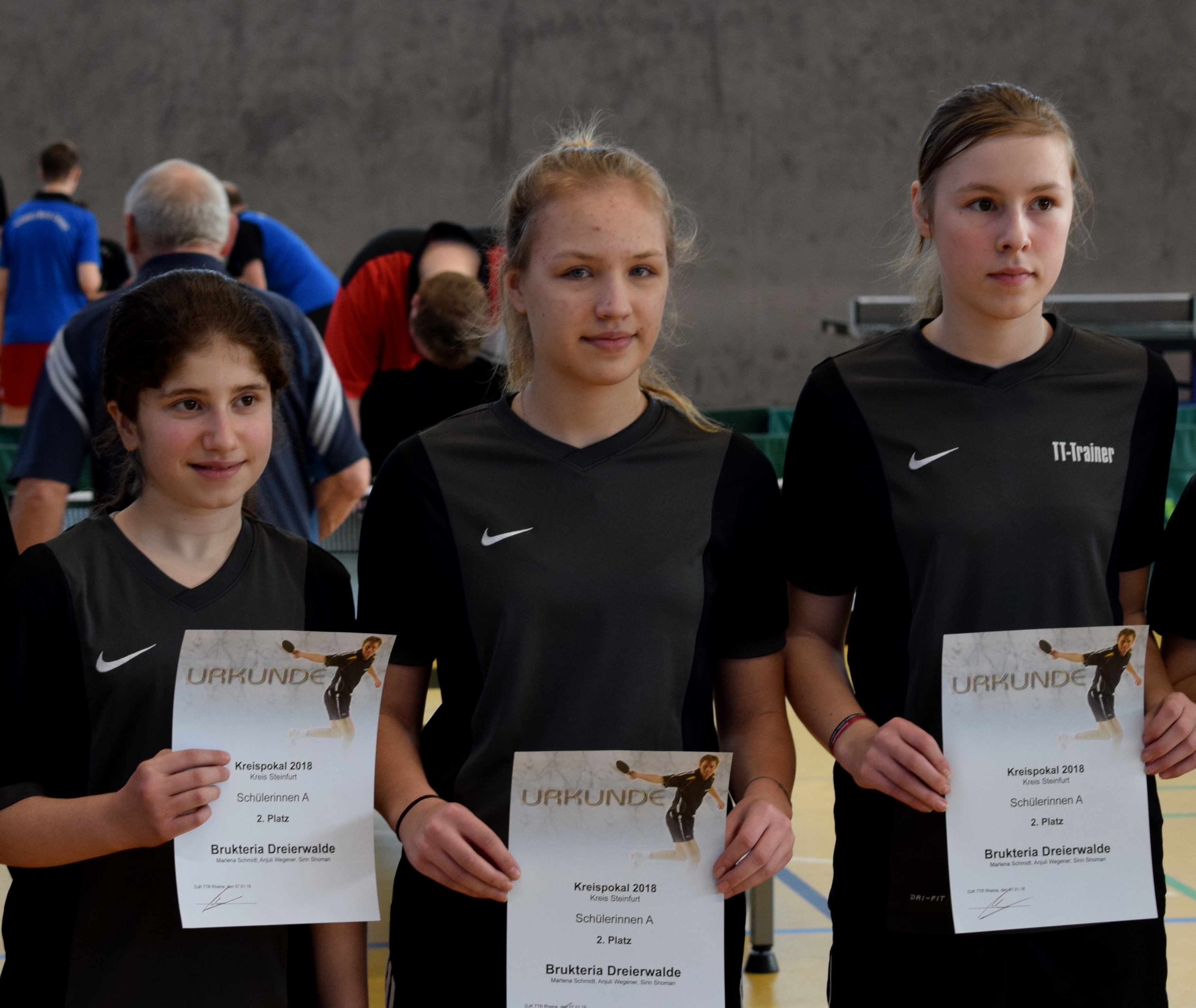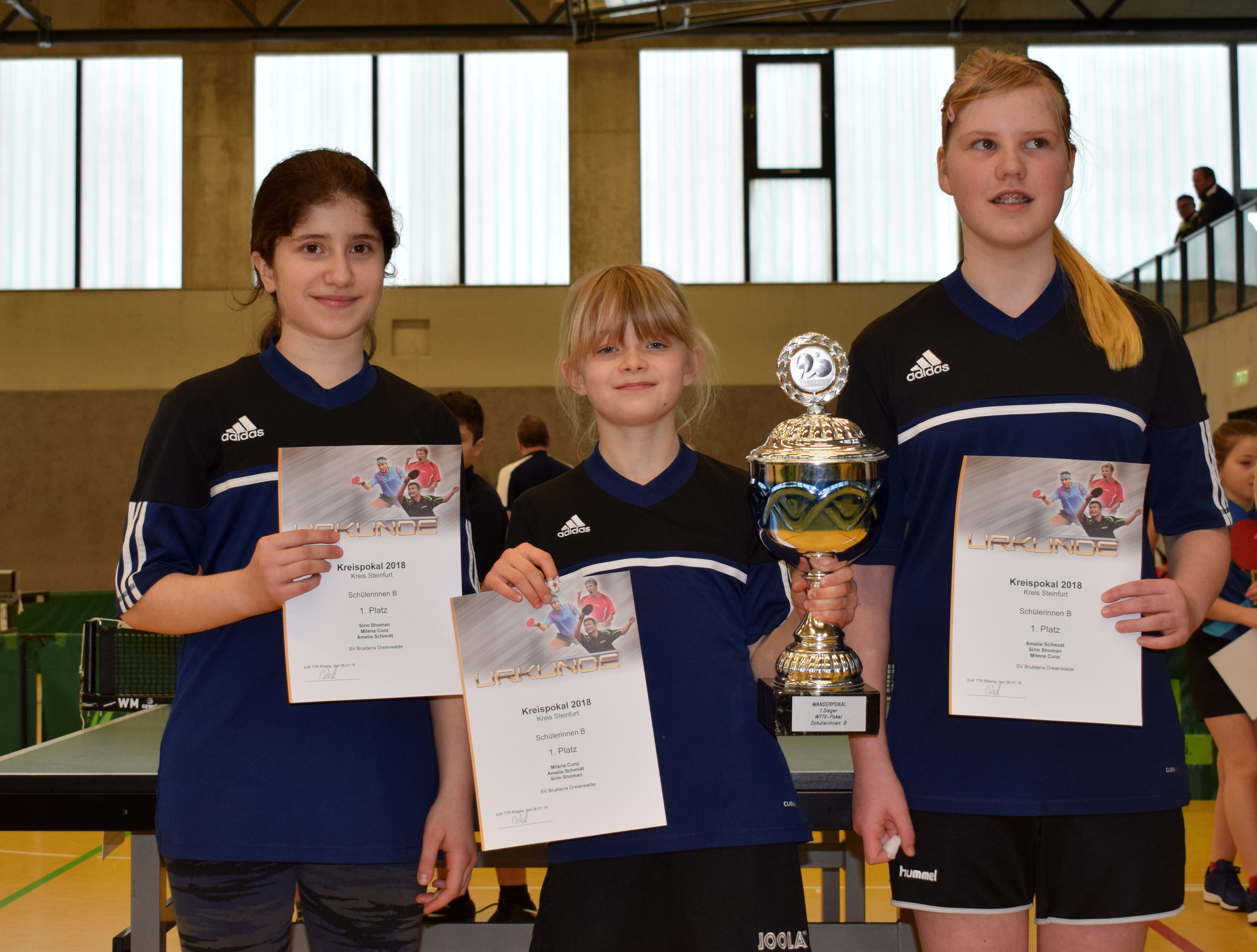 Als vierte Dreierwalder-Mannschaft gingen die Schülerinnen B (Amelie Schmidt, Sirin Shoman und Milena Cunz) an den Start. Wie bei den Schülerinnen A wurde auch bei den Schülerinnen B in dem System Jeder-gegen-Jeden gespielt, da nur drei Mannschaften gemeldet wurden. Das erste Spiel gegen TTR Rheine wurde souverän mit 4:0 gewonnen. Im anschließenden Spiel gegen den TB Burgsteinfurt musste zwar ein Spiel abgegeben werden, aber mit dem 4:1 Sieg wurde man verdient Kreispokalsieger.
