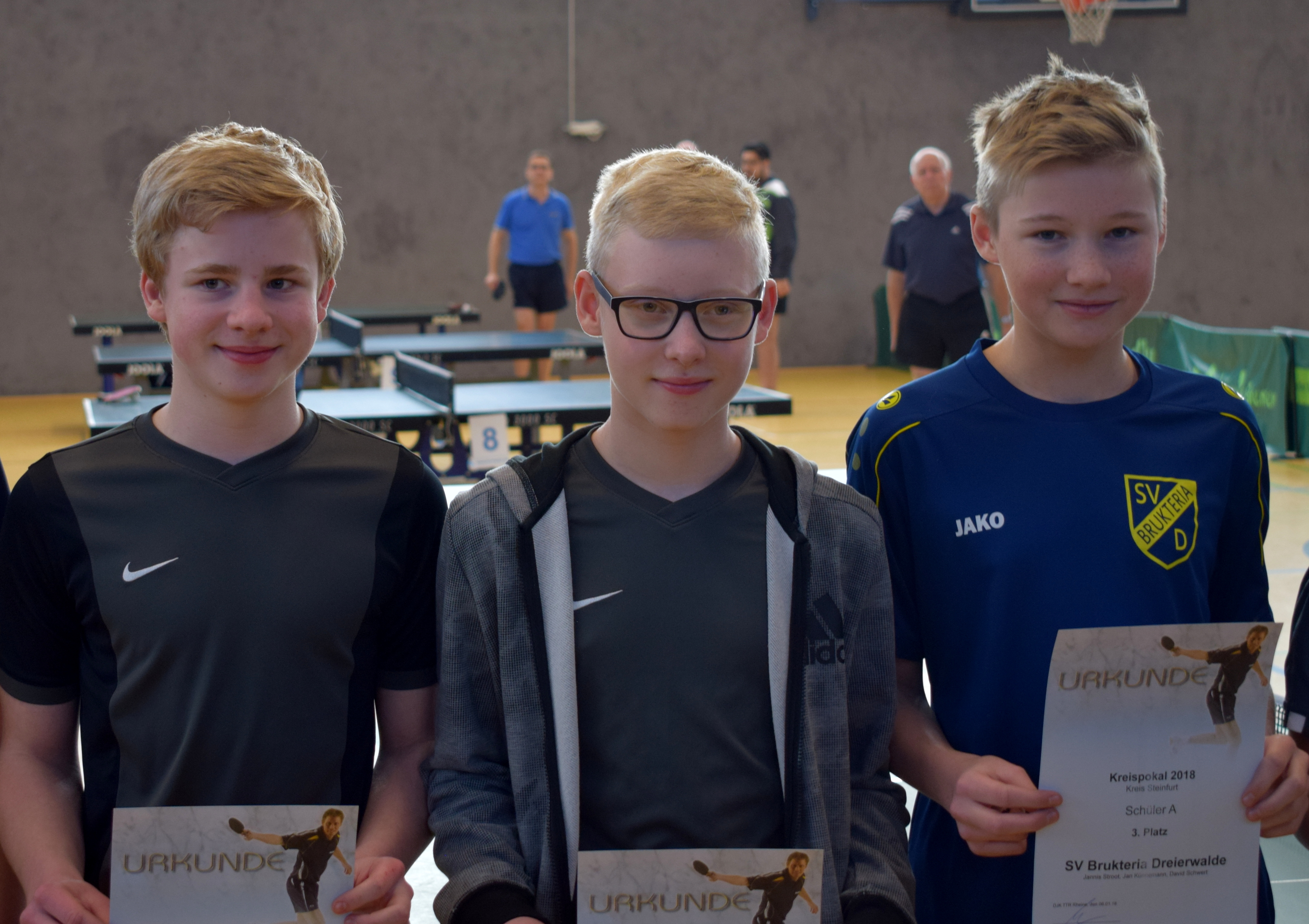 Bei den Schülern A (Jannis Stroot, Jan Künnemann und David Schwert) waren insgesamt sechs Mannschaften gemeldet, wodurch das vorgesehene K.O.-System gespielt werden konnte. Da man kein Freilos hatte, musste man in der Vorrunde gegen den SVC Laggenbeck antreten. Dieses Vorrundenspiel wurde souverän mit 4:0 gewonnen. Im anschließenden Halbfinale verlor man gegen den Turnierfavoriten und späteren Kreispokalsieger TTR Rheine deutlich mit 0:4. Jedoch konnte das stark aufspielende Doppel Stroot/Künnemann gegen die Rheinenser Koch/Riploh mithalten und sogar einen Satz gewinnen. Abschließend konnte sich das Team über den 3. Platz bei den Schülern A freuen.