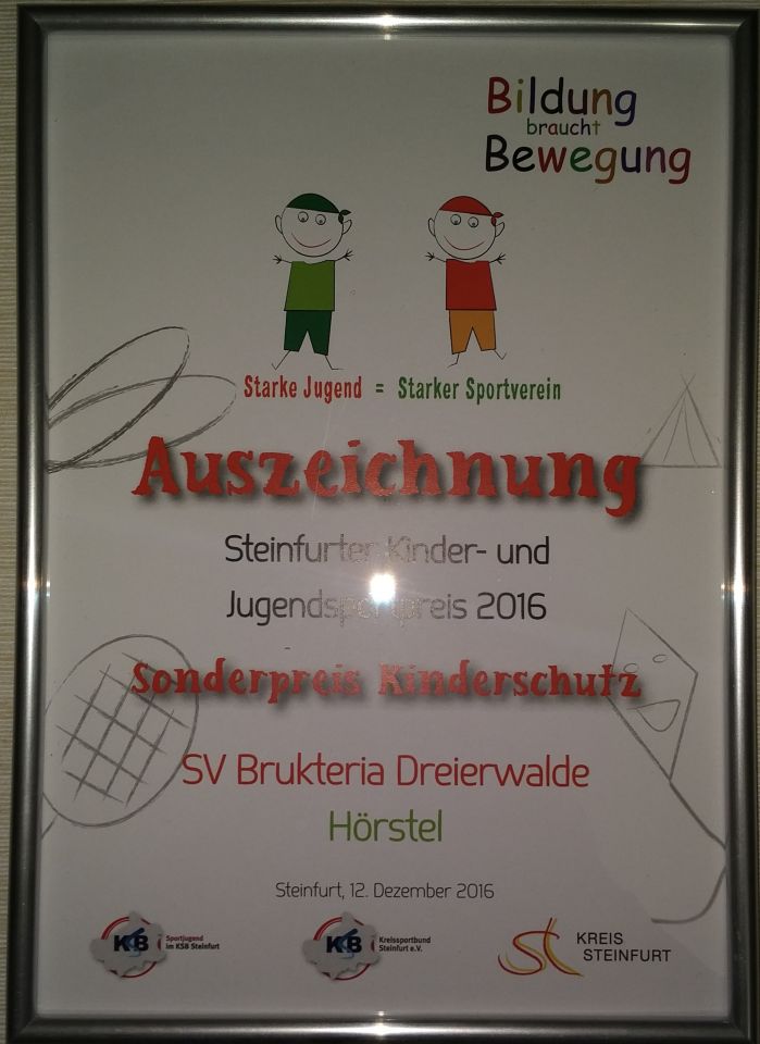 Am Montag den 12.12.2016 nahm Brukteria einen Sonderpreis "Kinderschutz" vom Kreis Steinfurt und der Sportjugend Steinfurt entgegen.