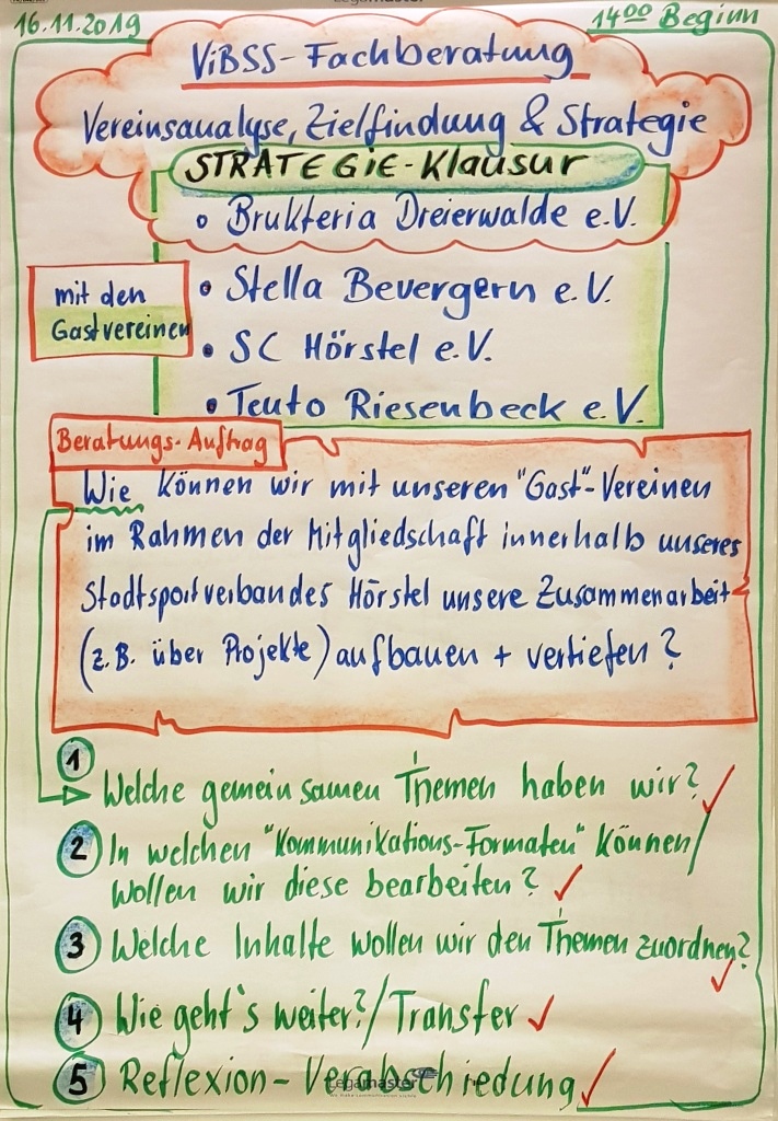 Mit Unterstützung von Klaus-Peter Uhlmann, freier Berater beim Landessportbund Nordrhein-Westfalen kamen insgesamt 16 Teilnehmer der Sportvereine Teuto Riesenbeck, SC Hörstel, Stella Bevergern und Brukteria Dreierwalde zusammen um über die Frage